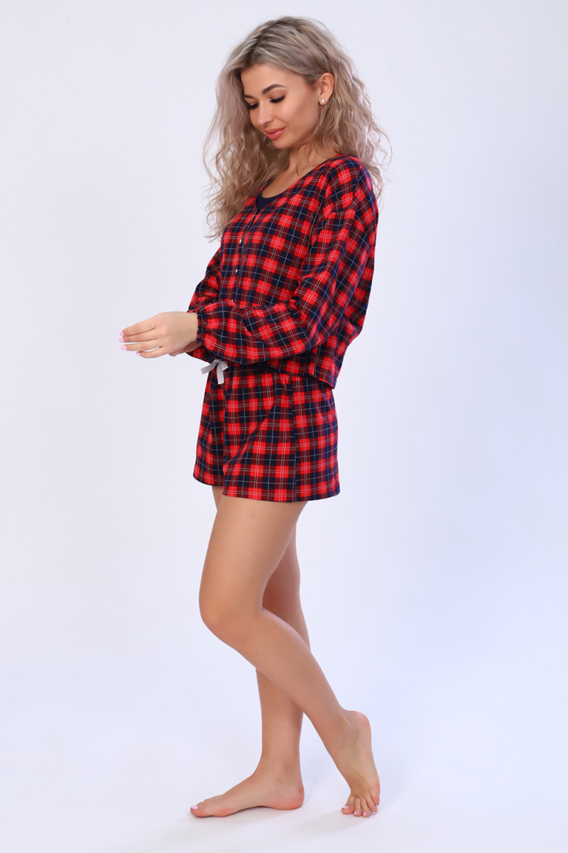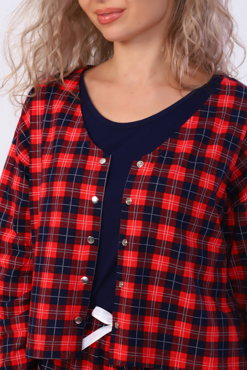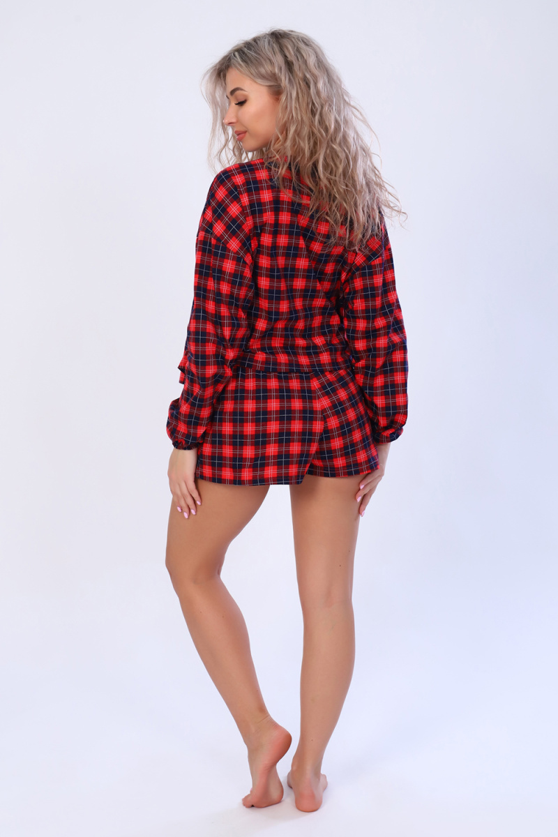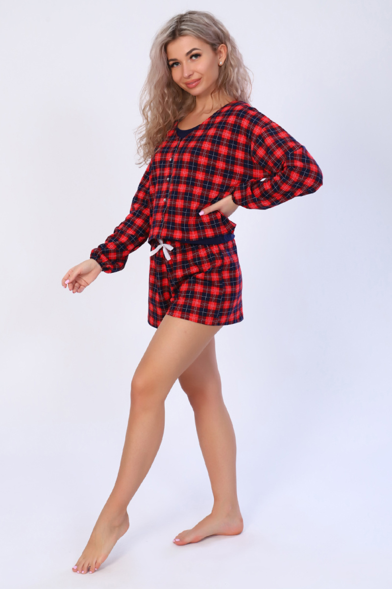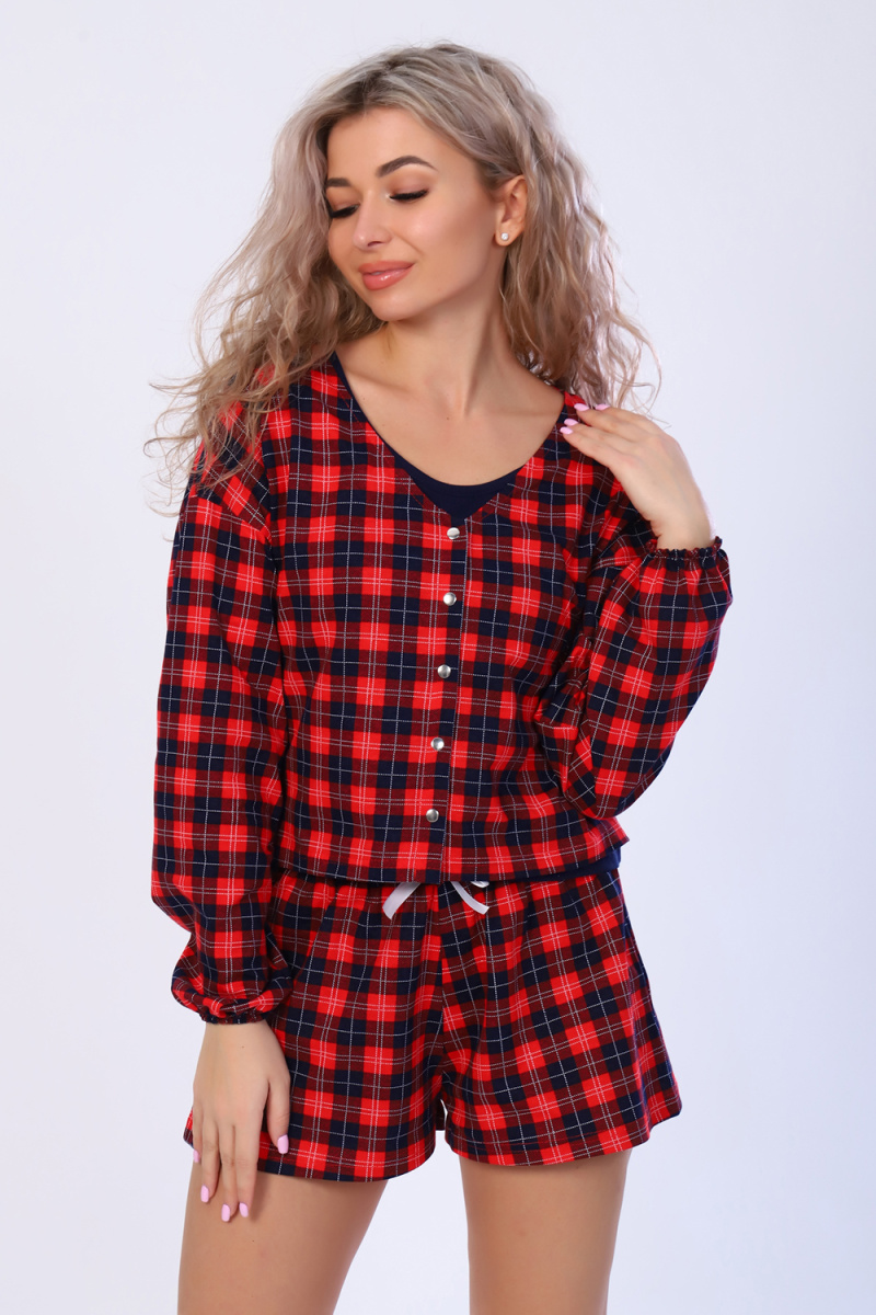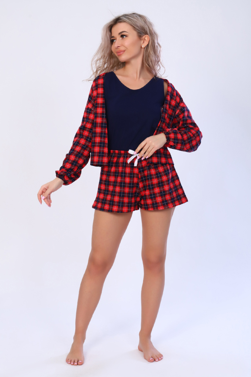 Ищите пижаму для себя, для подарка или домашних времяпрепровождений? Тогда наш комплект в классическую клетку из 100% хлопка - это тот самый идеальный вариант. Домашний костюм 3-ка включает в себя рубашку, майку и свободные шортики. Рубашка укороченная с V-образным вырезом, длинным рукавом на резинке и застёжкой на кнопки, что добавляет больше удобства и комфорта. Майка классическая, однотонная, без рукава. Шорты на резинке, свободные, укороченные и декорированы бантиком. Мягкий и приятный к телу костюмчик придется по вкусу ценителям уюта и роскоши.