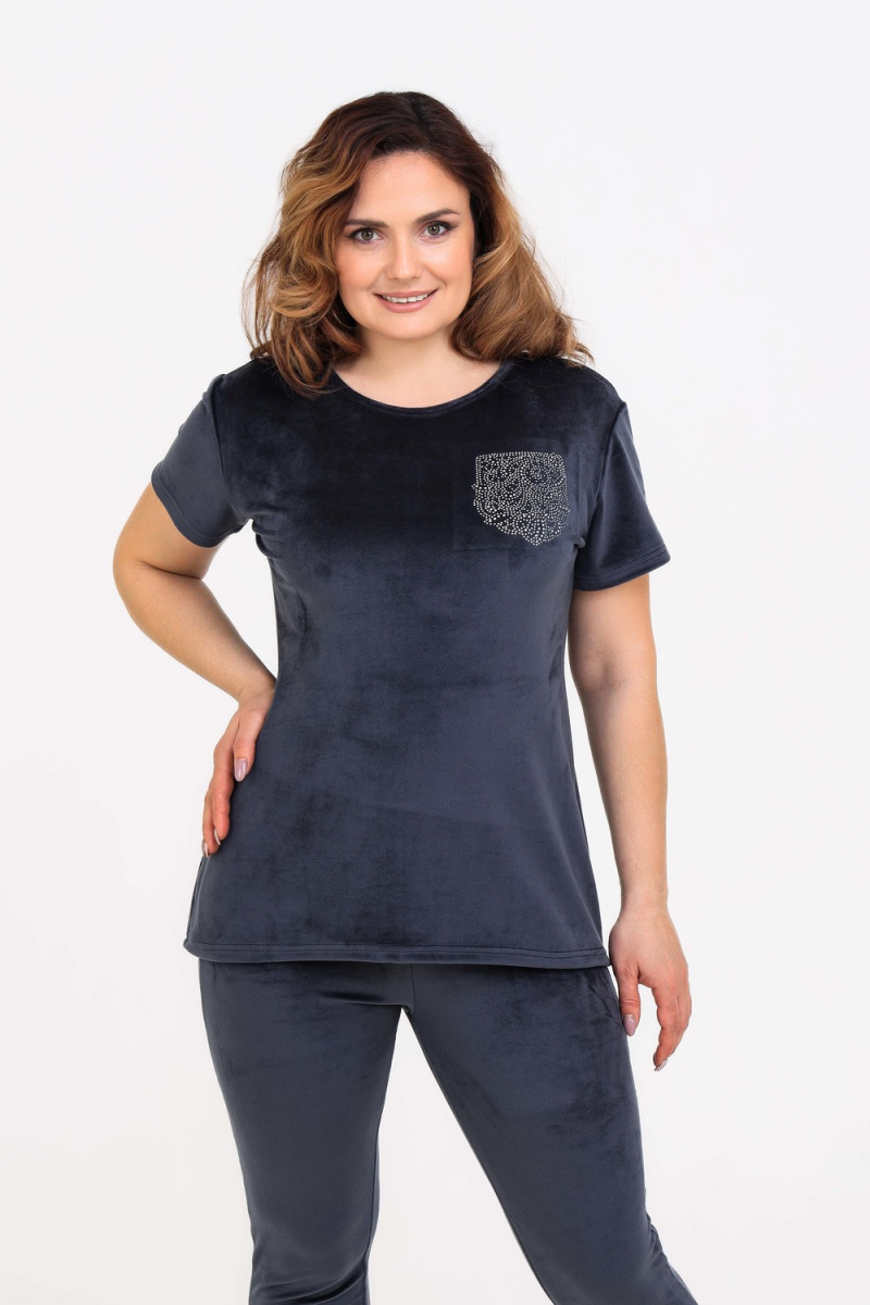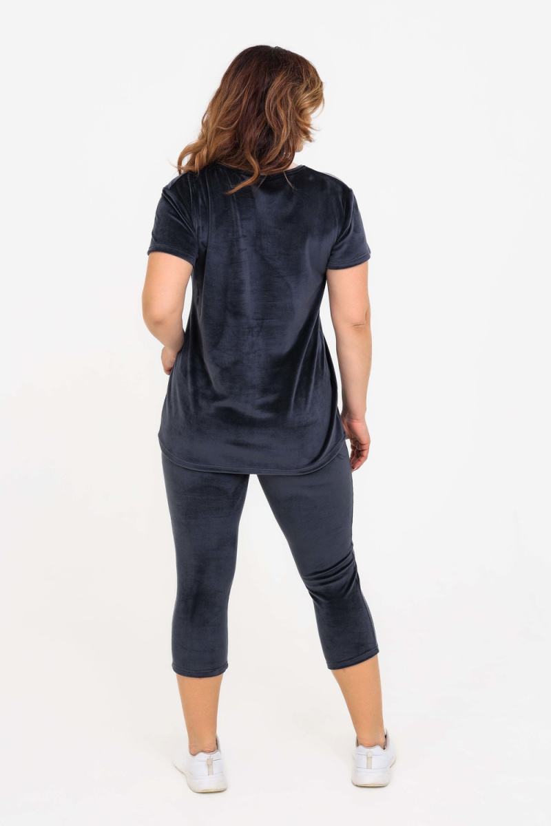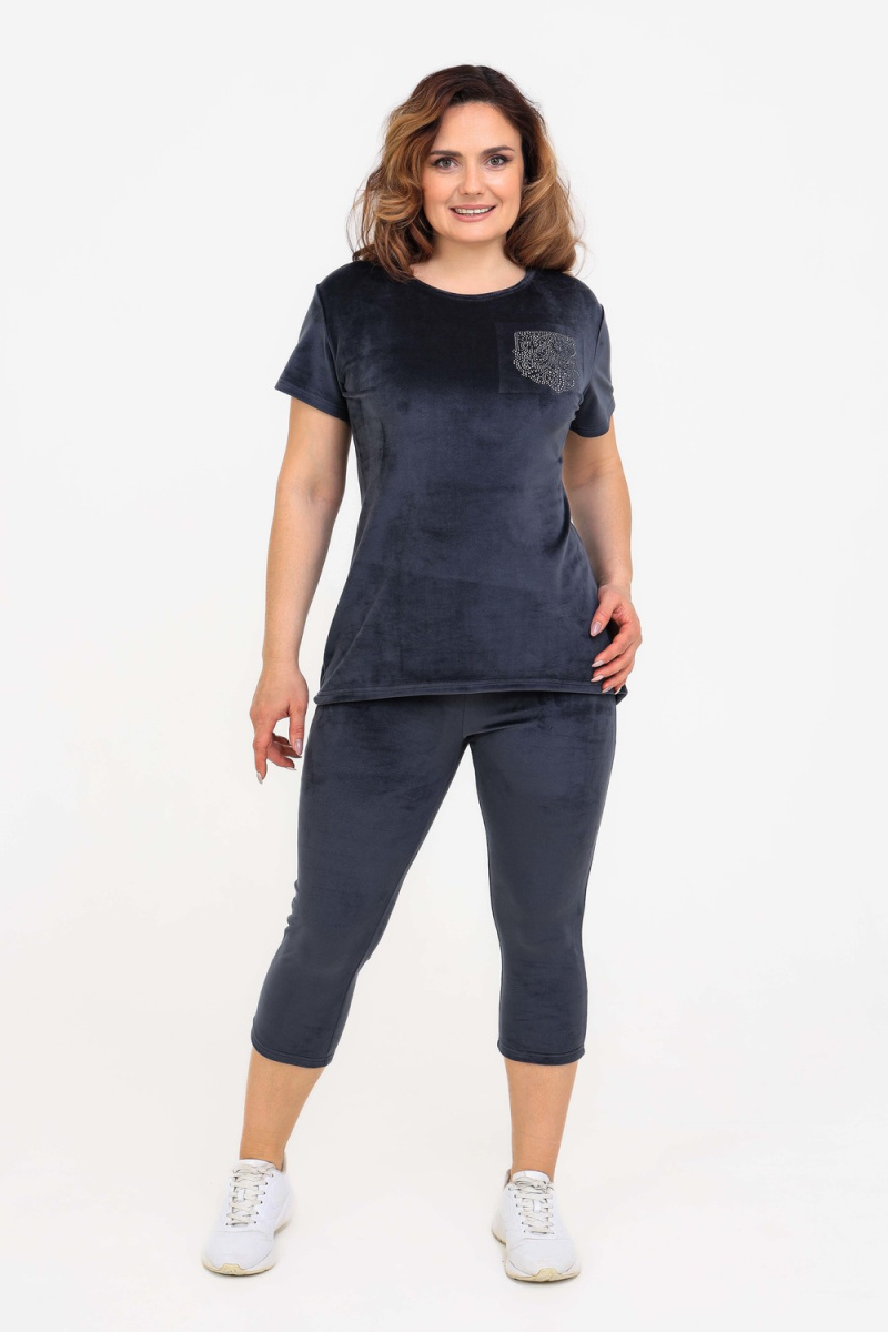 Костюм женский из велюра. В комплект входят:- футболка с коротким рукавом с округлым вырезом горловины и леггинсы. Мягкий трикотажный комплект для женщин Российского производства. Стильный костюм из стрейч - велюра для женщин представлен в широкой размерной сетке: от маленького 42 размера до 52 размера. Удобный домашний велюровый комплект не сковывает движений, что делает его универсальной одеждой, которая подойдет на любую фигуру как для худеньких, стройных, так и для пышных девушек и женщин. Костюм двойка женский подходит на любой рост: для высоких и для невысоких. Однотонный костюм с шортами выполнен в спокойных и практичных темных тонах. Бархатный комплект из трикотажной ткани не сковывает движения, скрывает недостатки и подчеркивает достоинства фигуры. Костюм из велюра не мнется, не дает усадку после стирок, не теряет цвет, сохраняет форму и внешний вид. Молодежный комплект подходит для девочек, подростков, молодых женщин, а также для женщин любого возраста, желающих модно выглядеть в домашней обстановке